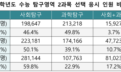 이투스교육연구소 자료에 따르면, 최근 3개년 수능 탐구 영역의 2과목 선택 조합을 분석한 결과 사회탐구와 과학탐구를 함께 선택하는 혼합 선택 응시자의 수와 비율이 지속적으로 증가하는 추세가 확인됩니다.