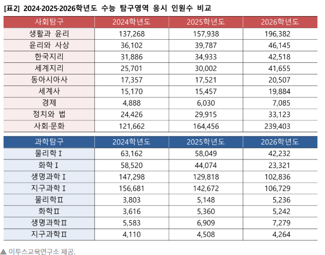 특히 2026학년도에는 사회탐구 2과목 응시자 수가 눈에 띄게 증가했는데, 이는 기존 과학탐구 2과목 응시자 가운데 상당수가 사회·과학 혼합 선택 또는 사회탐구 2과목 선택으로 이동했음을 보여줍니다. 선택형 수능 체제가 유지되는 마지막 해인 2027학년도에도 이러한 경향은 이어지거나 더욱 강화될 가능성이 큽니다.