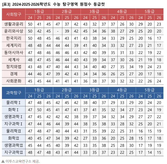 이는 특정 과목이 언제나 점수가 낮게 형성되거나 지속적으로 유리하다고 단정할 수 없음을 보여줍니다. 따라서 최근 3개년 등급 컷 자료는 탐구 과목 선택 시 참고 자료로 활용할 수는 있으나, 이를 절대적인 기준으로 해석하는 것은 주의가 필요합니다.