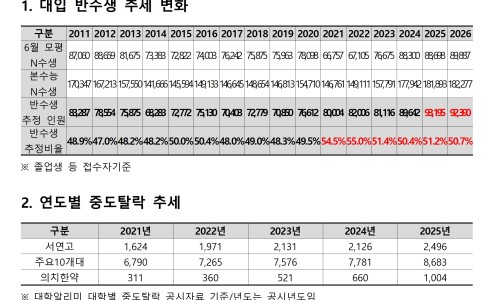 반수생 증가가 현실화될 경우 각 대학 재학생의 중도 이탈 규모가 함께 늘어날 수 있는 상황이라는 분석도 있습니다. 특히 3월 이후 상위권 대학 및 의학계열 신입생 가운데 대입 재도전에 나서는 반수생이 늘어날 수 있다는 전망이 나옵니다.