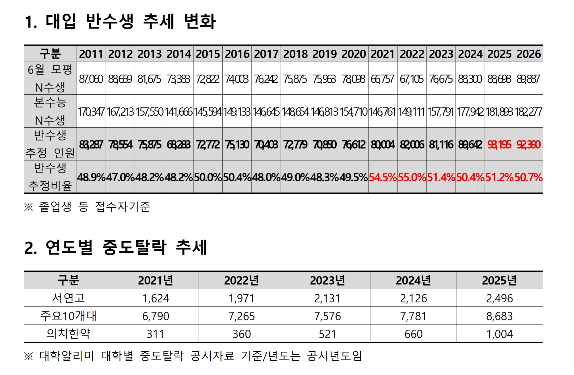 대학 중도탈락 규모도 함께 주목됩니다. 2025년 공시 기준으로 ▲서연고 중도탈락자 2496명 ▲주요 10개대 중도탈락자 8683명 ▲의치한약 중도탈락자 1004명으로, 최근 5년 새 최고치로 집계됐습니다. 세부적으로 서연고 중도탈락자는 ▲2021년 1624명 ▲2022년 1971명 ▲2023년 2131명 ▲2024년 2126명 ▲2025년 2496명입니다.