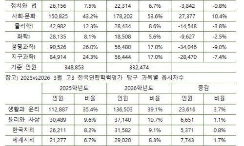 이번 3월 학평에는 약 33만 명이 응시한 가운데, 사회탐구 영역에서는 ‘사회·문화’와 ‘생활과 윤리’로의 집중 현상이 뚜렷하게 나타났습니다.