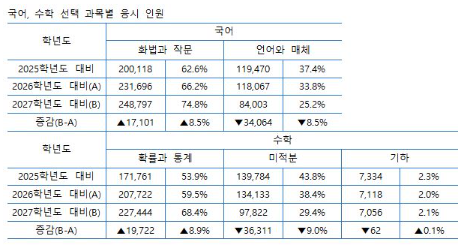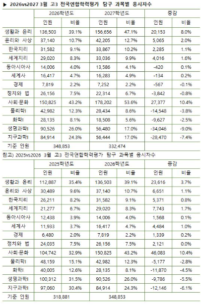 2027학년도 수능 대비 3월 학력평가(이하 ‘학평’) 응시 인원에서 ‘국어 화법과 작문, 수학 확률과 통계, 탐구 영역의 사회·문화, 생활과 윤리’ 과목으로의 쏠림 현상이 매우 두드러지게 나타난 것으로 확인되었습니다.